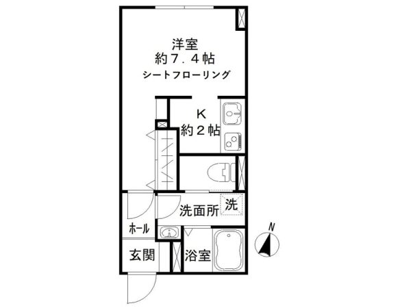 | 間取 | 1K (K:2帖・洋:7.4帖) |