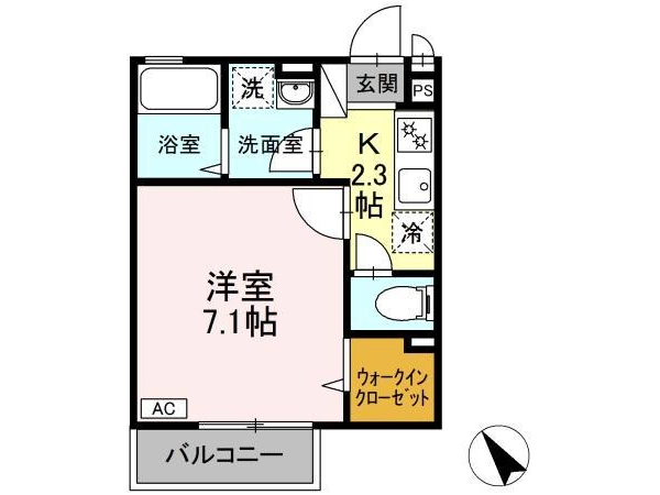 | 間取り詳細 | 1K (K:2.3帖・洋:7.1帖) |