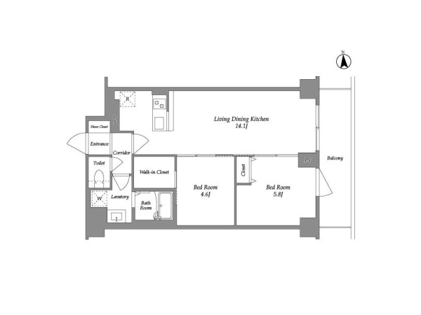 | 間取 | 2LDK (LDK:14.1帖・洋:5.8帖・洋:4.6帖) |