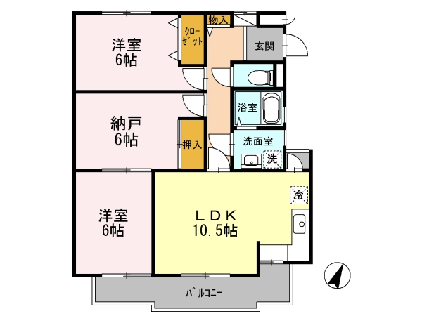| 間取 | 2LDK (LDK:10.5帖・S:6帖・洋:6帖・洋:6帖) |