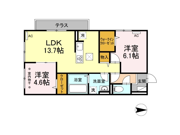| 間取 | 2LDK (LDK:13.7帖・洋:4.6帖・洋:6.1帖) |