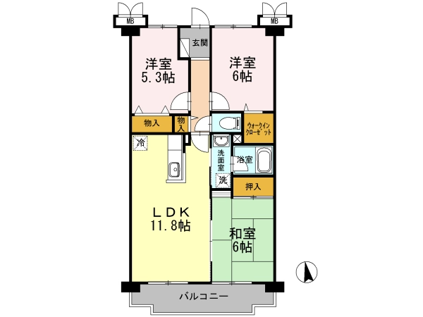 | 間取 | 3LDK (LDK:11.8帖・洋:6帖・洋:5.3帖・和:6畳) |