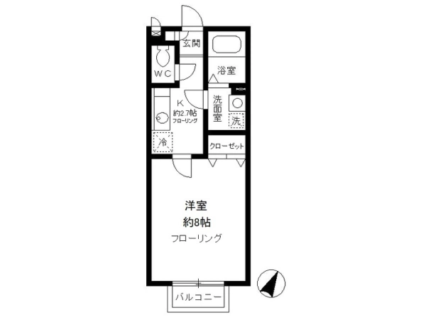 | 間取 | 1K (K:2.7帖・洋:8帖) |