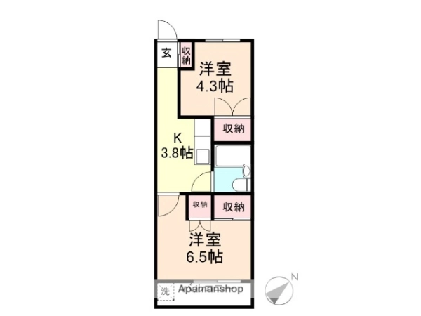 | 間取 | 2K (K:3.8帖・洋:6.5帖・洋:4.3帖) |